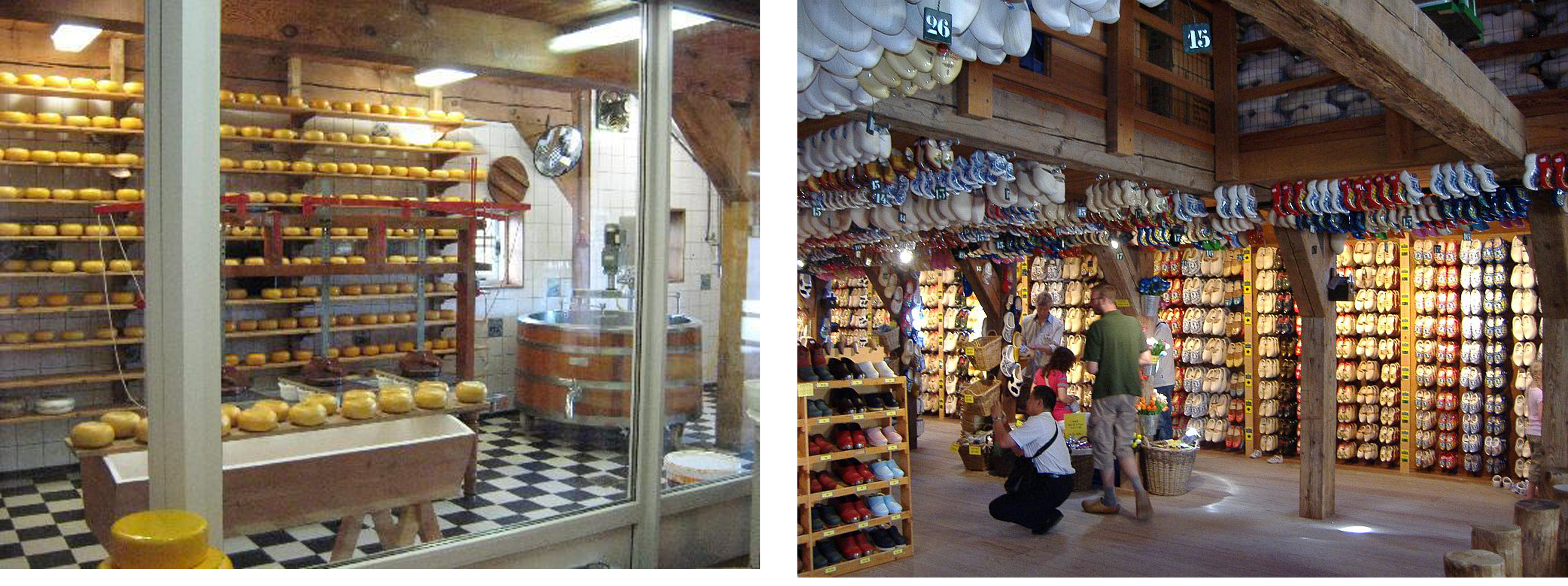 Este bucólico paraje a orillas del río Zaans es un fiel reflejo de cómo vivían antiguamente los holandeses. Aún hoy, los gigantes quijotescos están habitados por familias enteras. Una quesería donde se imparten talleres y catas, una destilería de licores artesanales, el museo del reloj, la fábrica de galletas de la firma Verkade, incluso, un museo-taller de zuecos que además de mostrar una colección de centenares de zapatos apuestan por estilos renovados que incluyen tacones de aguja, unos zueco-patines y unos con diamantes y piedras preciosas engarzadas, son algunos de las actividades centenarias que se pueden ver en este lugar.